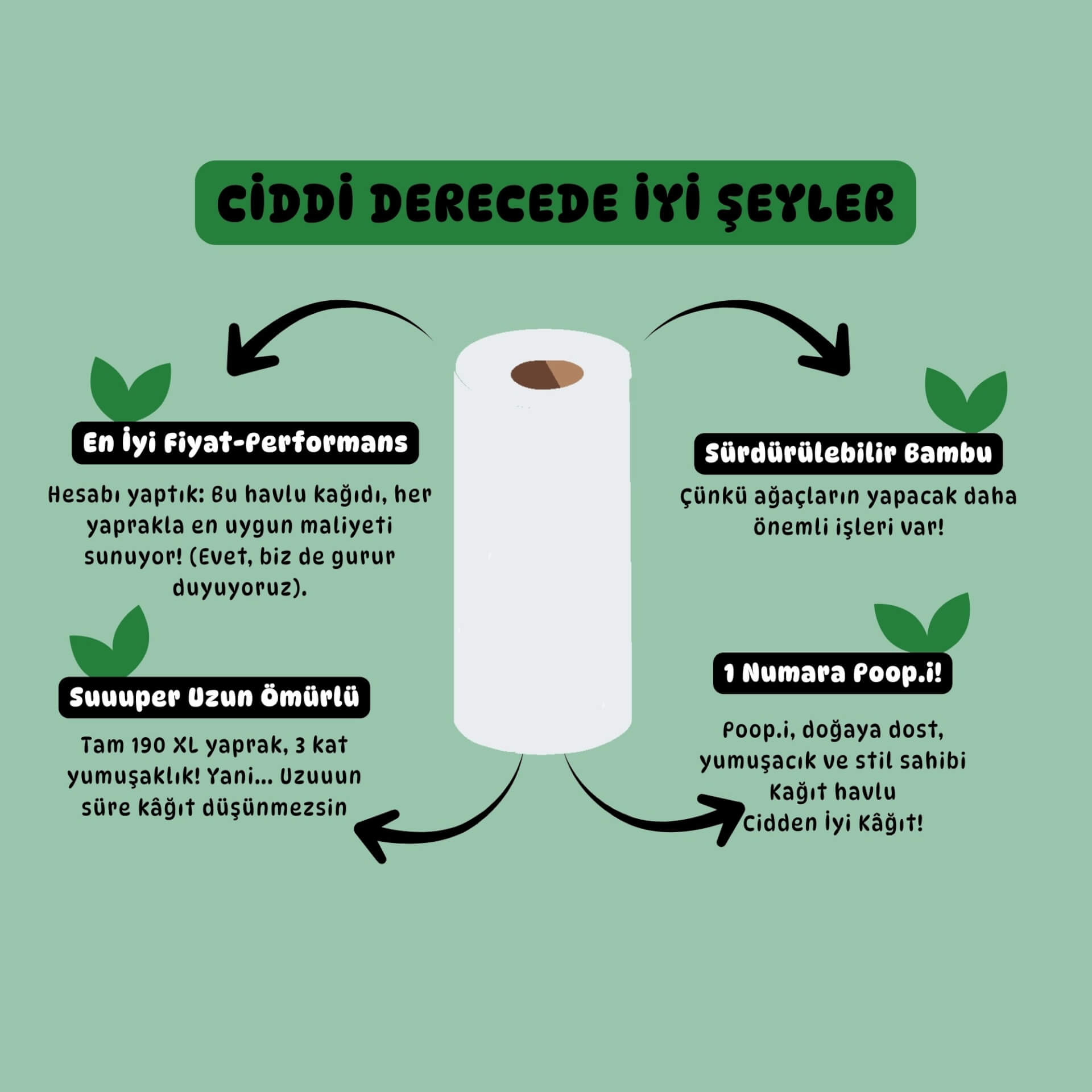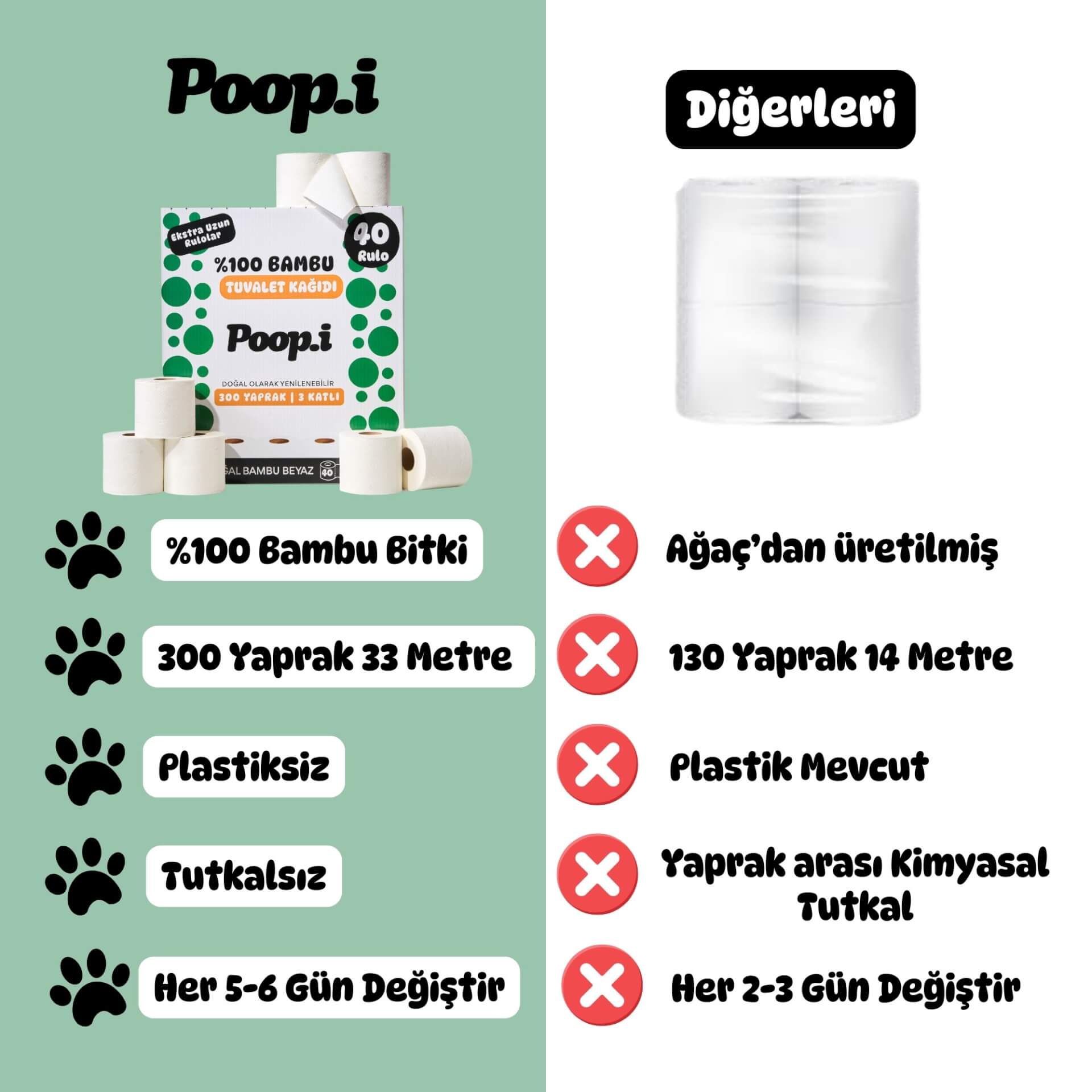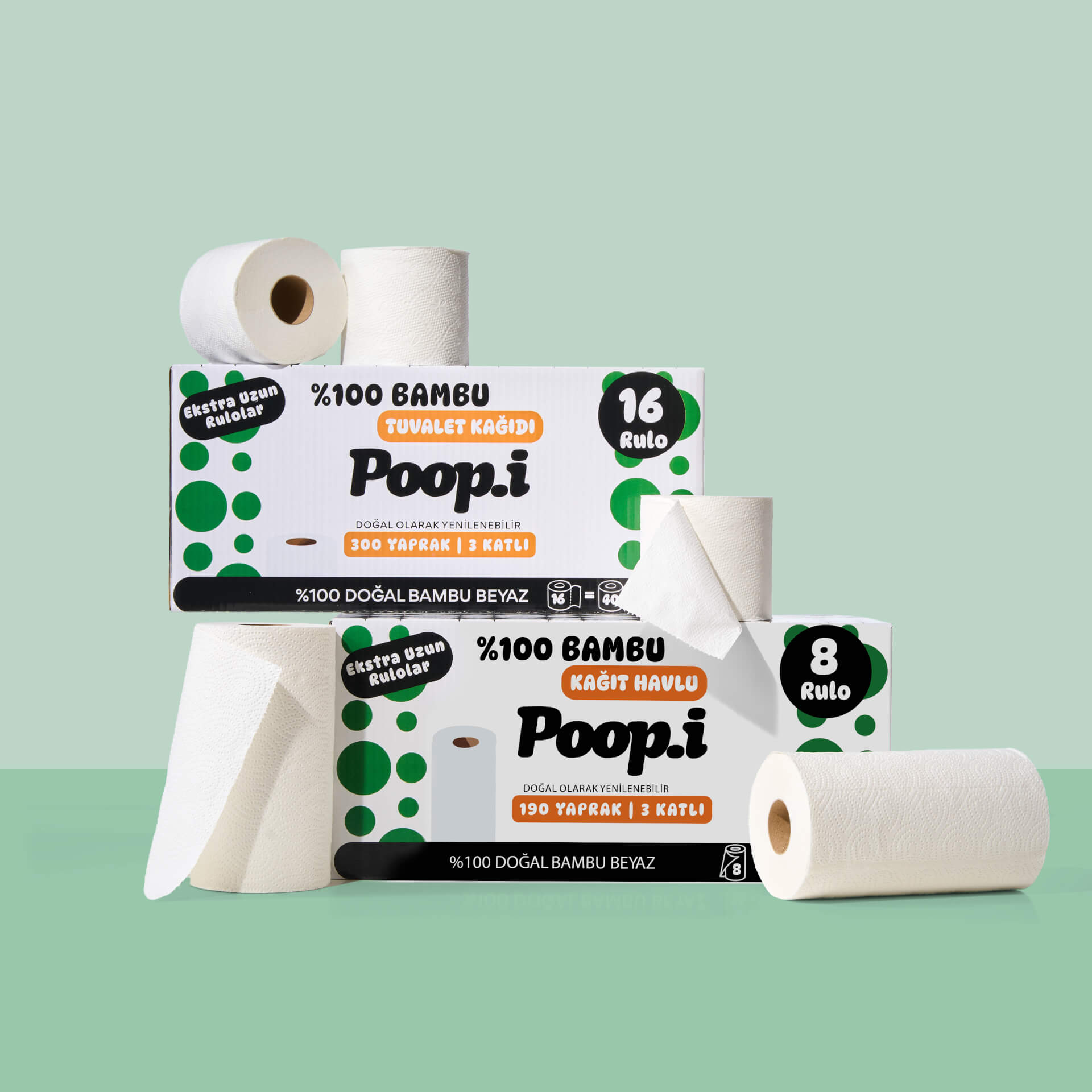 Hızla büyüyen, kendini yenileyebilen bambudan üretilen tuvalet kâğıtları uzun, dayanıklı ve ipeksi yumuşak. Aynı bambu liflerinden üretilen kağıt havlular ise yüksek emicilik ve güç sunar — tek yaprak çoğu zaman yeter.
